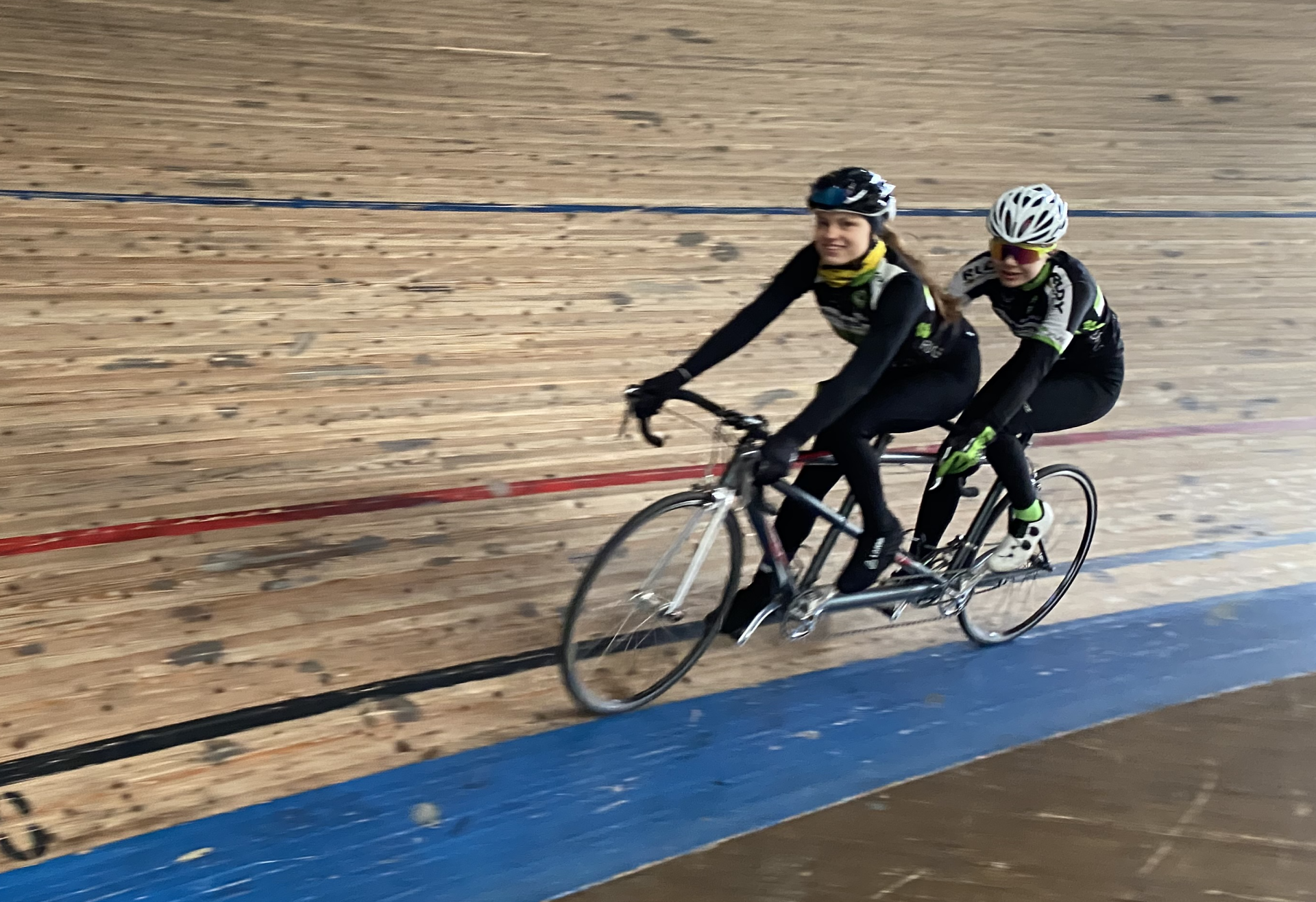 Übungsfahrt mit dem Bahnradtandem – zwei Tandem-Pilotinnen fahren mit einem Bahnradtandem auf der Radrennbahn Augsburg
